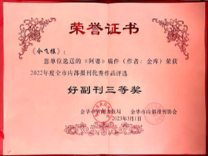 今飛報(bào)-選送的《阿婆》稿件(作者:金庫(kù))榮獲2022年度全市內(nèi)部報(bào)刊優(yōu)秀作品評(píng)選好副刊三等獎(jiǎng)