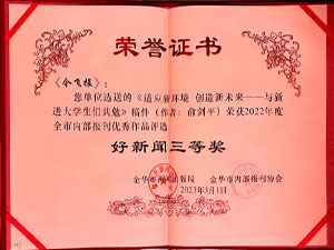 今飛報(bào)-選送的《適應(yīng)新環(huán)境 創(chuàng)造新未來(lái)——與新近大學(xué)生們共勉》稿件(作者:俞劍平)榮獲2022年度全市內(nèi)部報(bào)刊優(yōu)秀作品評(píng)選好新聞三等獎(jiǎng)
