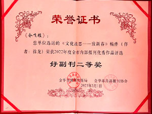 今飛報(bào)-選送的《文化淺思——致新春》稿件(作者:徐龍)榮獲2022年度全市內(nèi)部報(bào)刊優(yōu)秀作品評(píng)選好新聞三等獎(jiǎng)