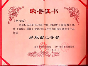 今飛報(bào)-選送的2022年12月8日第一版《要聞版》稿件(編輯:楊洋)榮獲2022年度全市內(nèi)部報(bào)刊優(yōu)秀作品評(píng)選好版面三等獎(jiǎng)